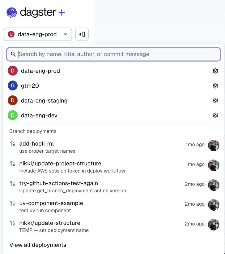 To see how your changes will look in production without altering production data, you can use branch deployments. To get started, make your changes in a Git branch and create a pull request, then select your branch from the deployment dropdown in the Dagster+ Serverless UI:
